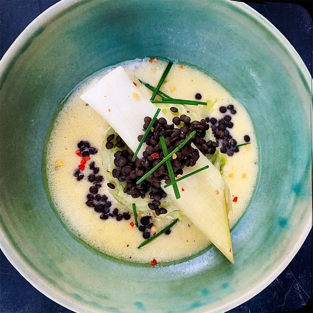 31 okt Geblakerde prei, stamppot van spruitjes, beluga linzen en beurre blanc