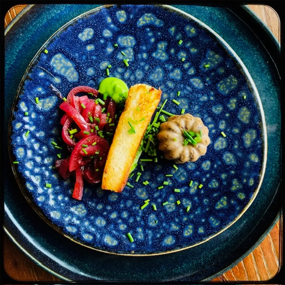 We begonnen het diner met een kleine amuse waarvan ik graag het recept met u deel; een stevige, hartige paté van kastanje en linzen. Geserveerd met een knapperig gebakken stukje brood en marmelade van rode ui. Na veel rondzoeken vonden we toch wat daslook die in de buitengebieden van de stad de kop opstak, draaiden daar een olie van die we gebruikten voor een daslookmayonaise. Die we in kleine dotjes op het brood spoten. Bestrooien met wat bieslook, smullen maar!